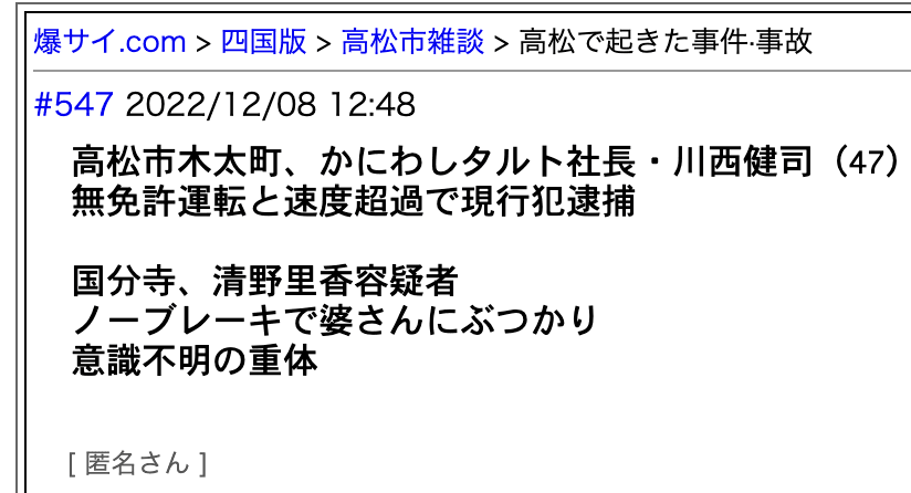 代表取締役である川西健司さんが、無免許運転で速度超過で現行犯逮捕されたという情報がありました。