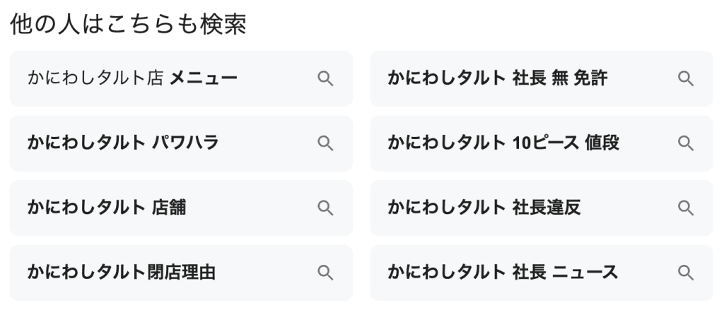 かにわしタルト店で検索すると、まず候補ででてきたのは「社長逮捕」というワードでした。