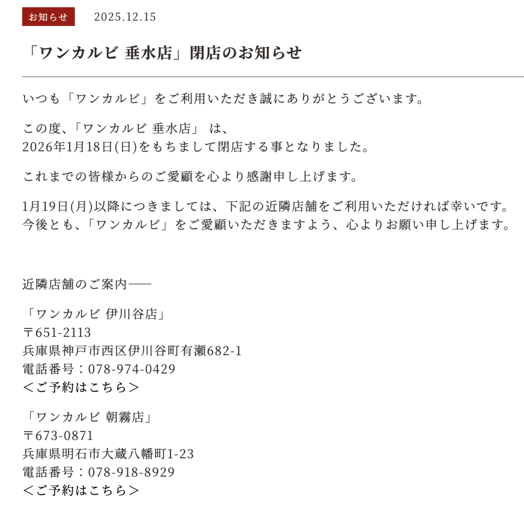 | 2025年12月15日 | 公式サイトにて、「ワンカルビ垂水店」が2026年1月18日をもって閉店することを発表しました。 |