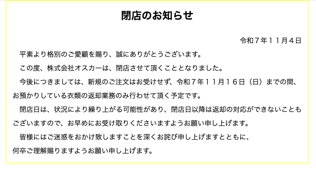 山梨県と長野県で長年親しまれてきたクリーニングの「オスカー」が、2025年11月16日をもって全店閉店することを発表。