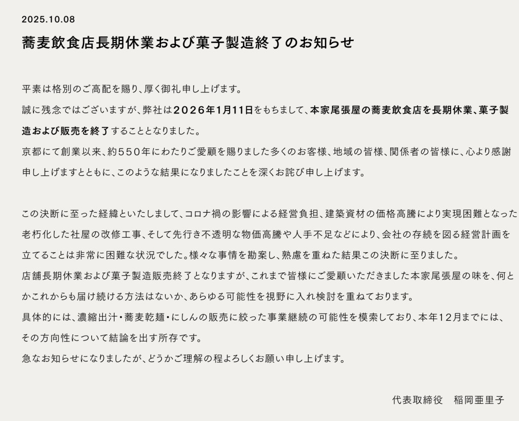 完全に消えてなくなるわけではないようです。2026年1月11日をもって、お店での飲食営業は「長期休業」に入り、そば餅などの菓子製造は終了となります。ですが、会社や「本家尾張屋」という屋号は存続します。今後は、お店で提供されていたお出汁(濃縮タイプ)や乾麺、にしんの甘露煮などをインターネット通販(EC)で販売することに事業を絞り、ブランドを継続していく方法を検討しているとのことです。2025年12月頃には今後の具体的な方向性が発表される予定なので、続報を待ちたいですね。