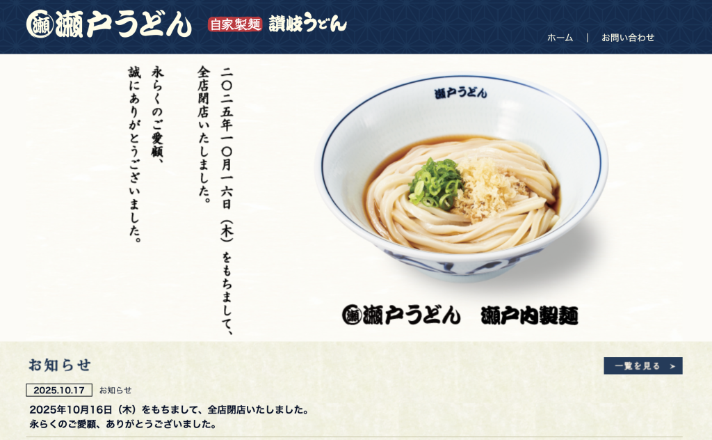 残念ながらその通りです。瀬戸うどんの公式サイトおよび公式X(旧Twitter)アカウントにて、2025年10月16日(木)をもって全店舗の営業を終了したことが正式に発表されています。日本全国にあったすべての「瀬戸うどん」および「瀬戸内製麺」ブランドの店舗が閉店となりました。