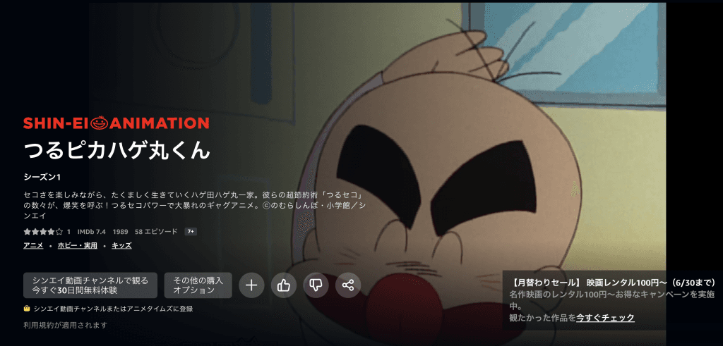 ちなみにつるピカハゲ丸くんを見るなら月額600円で30日間の無料期間があるAmazon Prime Videoが最安値で、私も見ていますがおすすめですよ。